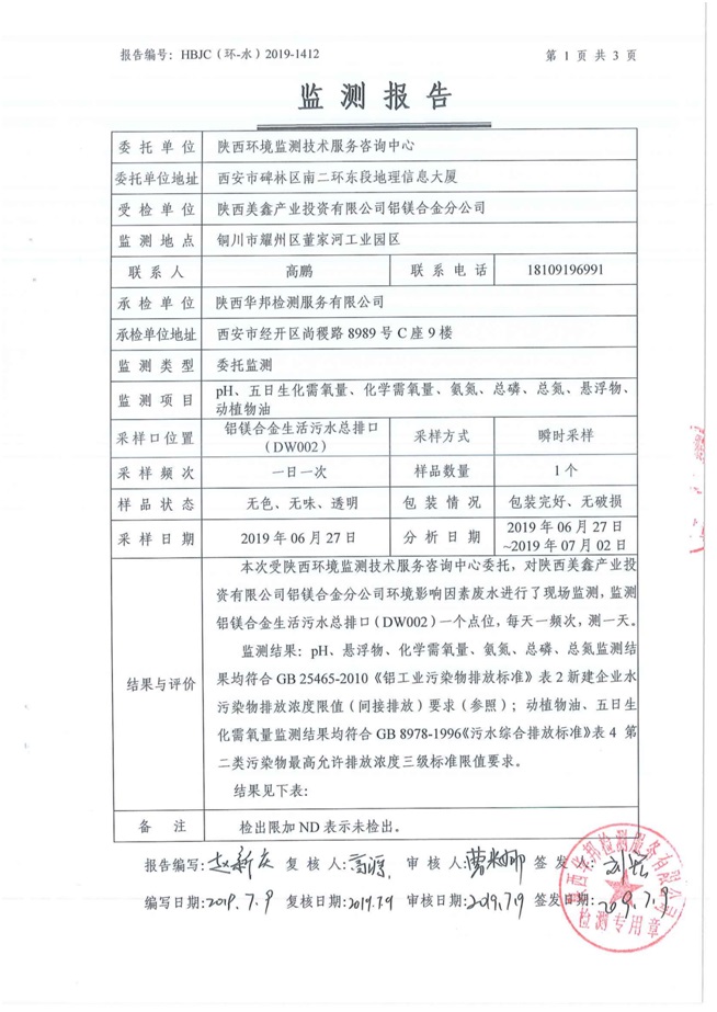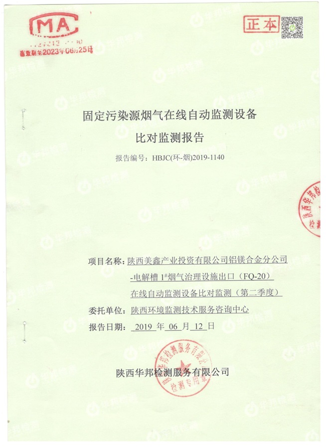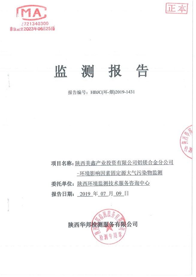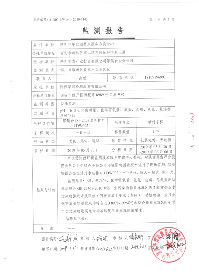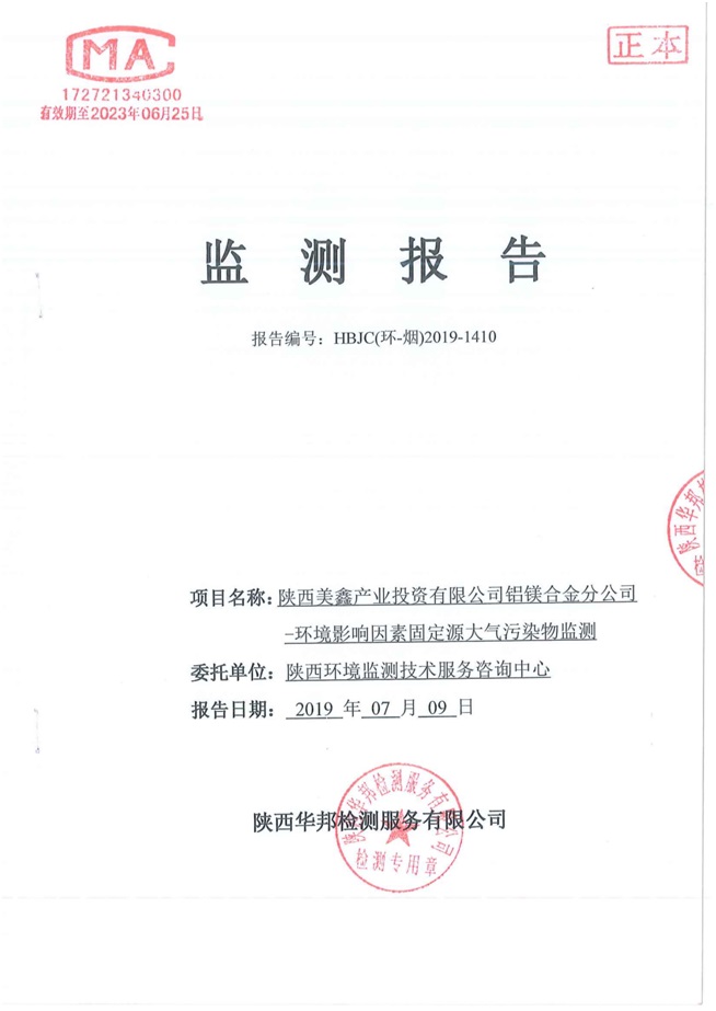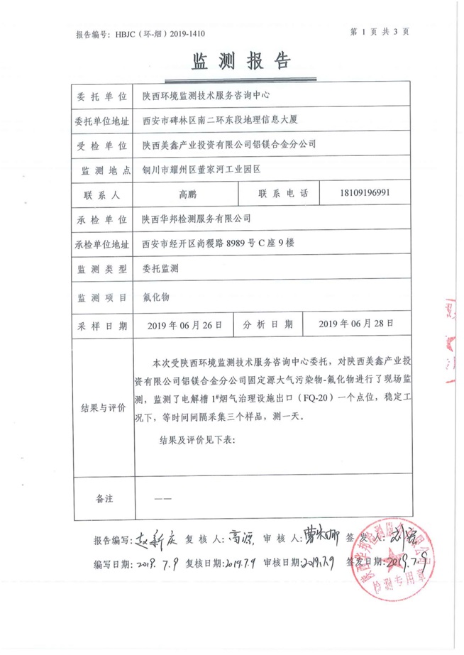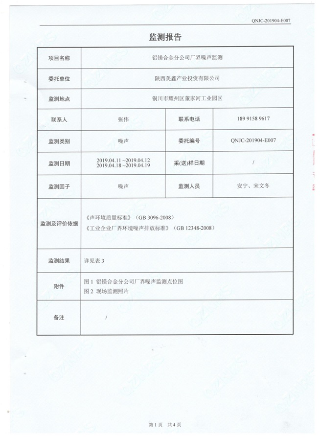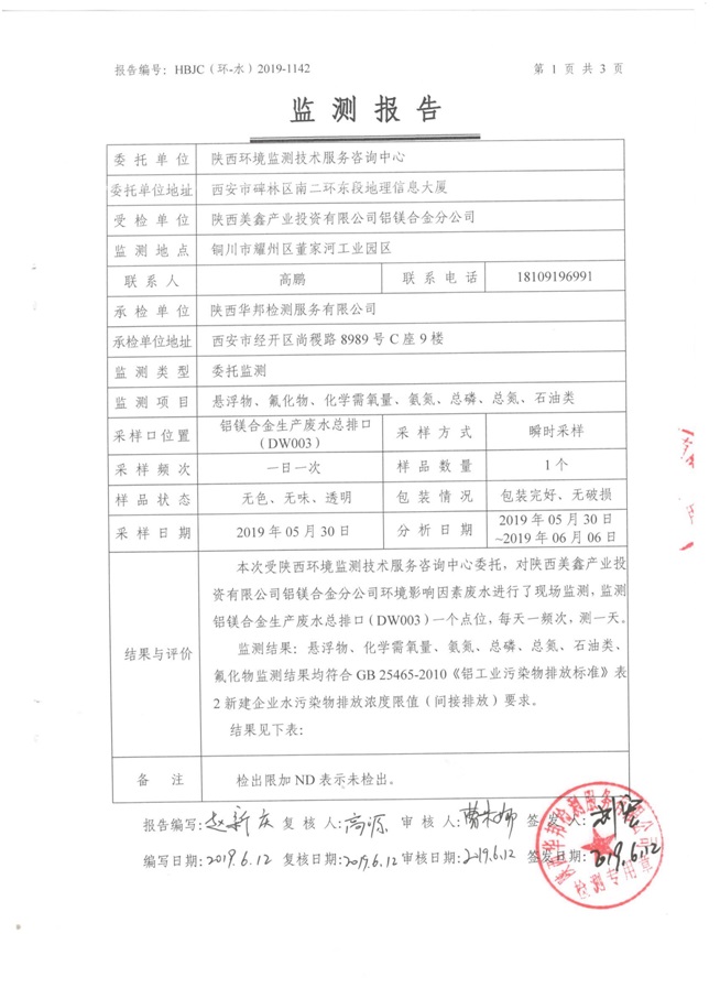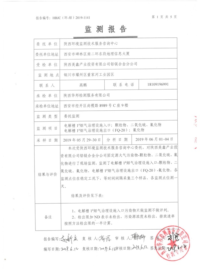 一、基礎(chǔ)信息: 陜西美鑫產(chǎn)業(yè)投資有限公司 統(tǒng)一社會(huì)信用代碼:91610200567136996Y 法定代表人:高曉兵 生產(chǎn)地址:陜西省銅川市董家河工業(yè)園區(qū) 聯(lián)系方式:09196982605 生產(chǎn)經(jīng)營和管理服務(wù)的主要內(nèi)容、產(chǎn)品及規(guī)模: 美鑫公司在陜西有色、陜西煤化兩大集團(tuán)的正確領(lǐng)導(dǎo)下,在銅川市委、市政府的關(guān)心支持下,充分利用銅川資源型城市轉(zhuǎn)型政策,依托園區(qū)區(qū)位優(yōu)勢(shì),擬投資150億元,建設(shè)年產(chǎn)30萬噸預(yù)焙陽極、120萬噸煤礦、30萬噸鋁鎂合金及配套動(dòng)力站、20萬噸鋁深加工、年吞吐量500—800萬噸物流園等循環(huán)經(jīng)濟(jì)項(xiàng)目。該集群項(xiàng)目已被列入《陜西省國民經(jīng)濟(jì)和社會(huì)發(fā)展第十二個(gè)五年規(guī)劃綱要》,為陜西省“58123”項(xiàng)目之一。美鑫公司以循環(huán)經(jīng)濟(jì)為路徑,堅(jiān)持經(jīng)濟(jì)增長與環(huán)境保護(hù)協(xié)調(diào)發(fā)展,聚合資源與資本,走綠色發(fā)展、清潔發(fā)展、低碳發(fā)展的循環(huán)經(jīng)濟(jì)轉(zhuǎn)型升級(jí)之路。 陜西美鑫鋁鎂合金分公司采用的500kA預(yù)焙陽極電解槽,自動(dòng)化程度高,電解槽打殼、加料全過程均由微機(jī)自動(dòng)控制,從而使槽罩開啟次數(shù)顯著降低,電解槽集氣效率能夠達(dá)到99%,大大地減少了煙氣無組織排放。項(xiàng)目配置了2套電解煙氣凈化系統(tǒng),經(jīng)捕集的煙氣通過排煙支管進(jìn)入排煙總管,采用電解鋁生產(chǎn)原料—氧化鋁吸附阻濾煙氣中的氟化氫氣體及含氟煙塵,吸附后的載負(fù)氧化鋁進(jìn)入袋式除塵器,經(jīng)氣固分離后進(jìn)入石灰石—石膏脫硫系統(tǒng)脫硫。 陜西美鑫產(chǎn)業(yè)投資有限公司鋁鎂合金分公司2019年2季度自行監(jiān)測(cè)如下: 二、監(jiān)測(cè)方案: 1 大氣污染源監(jiān)測(cè)