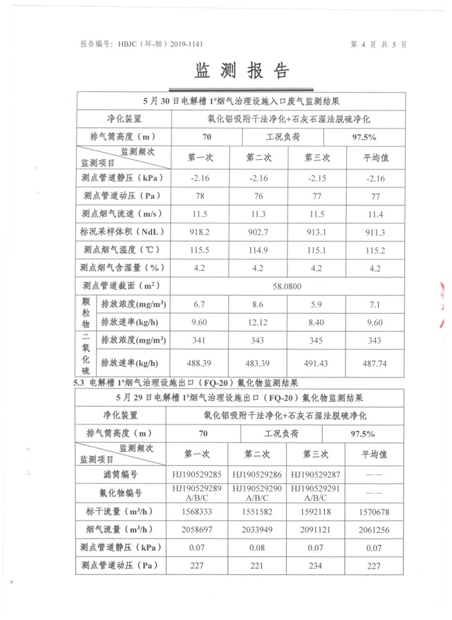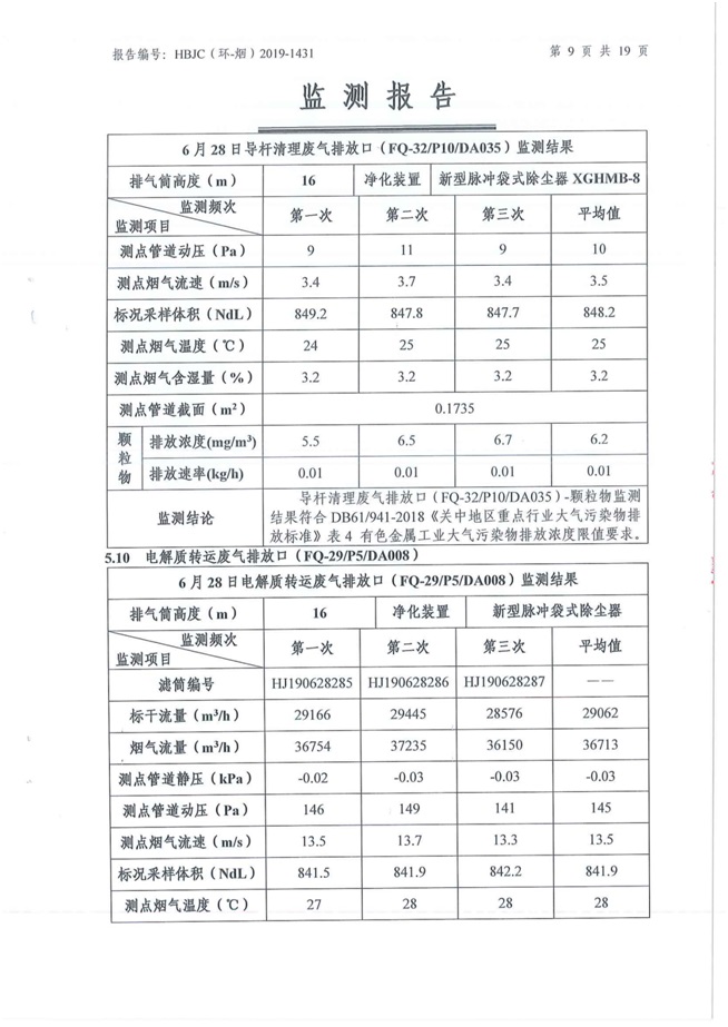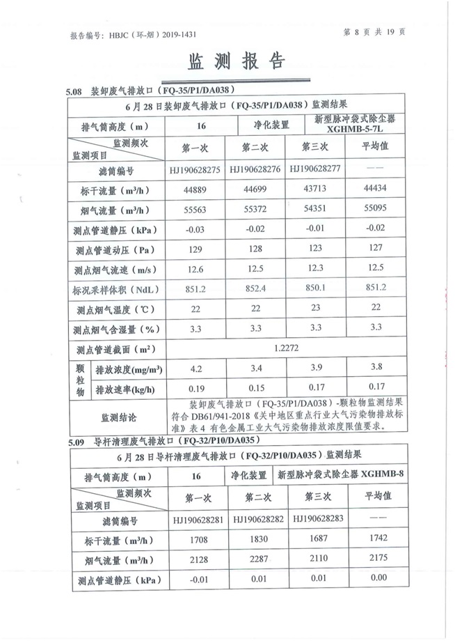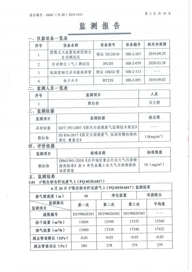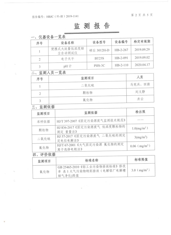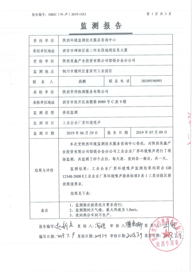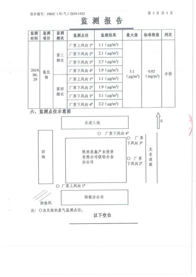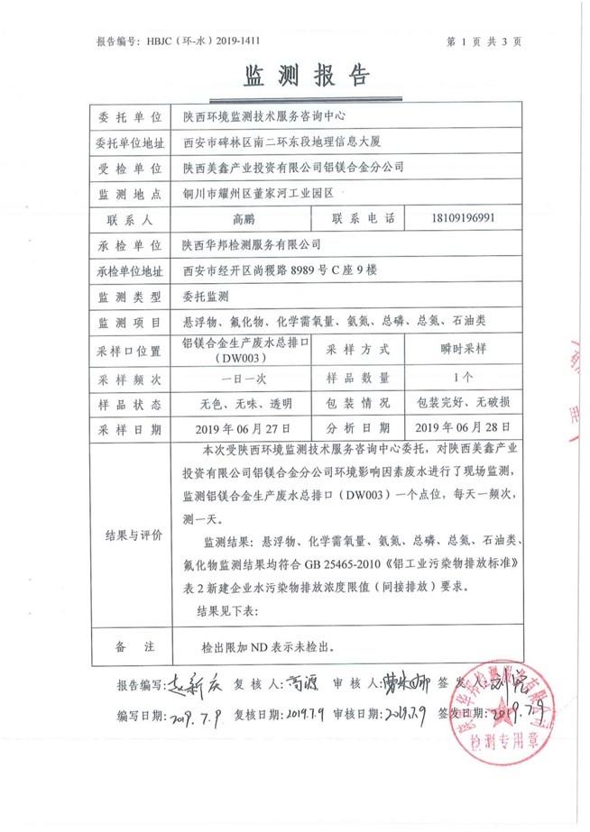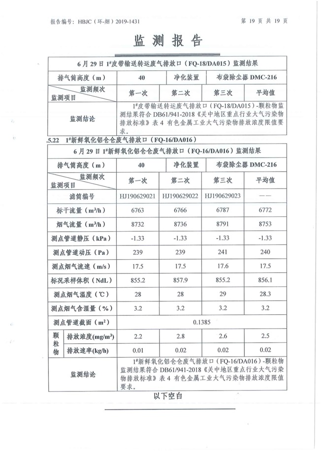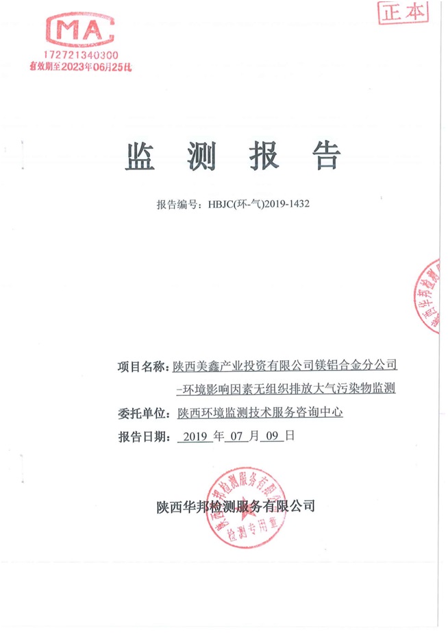 一、基礎(chǔ)信息: 陜西美鑫產(chǎn)業(yè)投資有限公司 統(tǒng)一社會(huì)信用代碼:91610200567136996Y 法定代表人:高曉兵 生產(chǎn)地址:陜西省銅川市董家河工業(yè)園區(qū) 聯(lián)系方式:09196982605 生產(chǎn)經(jīng)營和管理服務(wù)的主要內(nèi)容、產(chǎn)品及規(guī)模: 美鑫公司在陜西有色、陜西煤化兩大集團(tuán)的正確領(lǐng)導(dǎo)下,在銅川市委、市政府的關(guān)心支持下,充分利用銅川資源型城市轉(zhuǎn)型政策,依托園區(qū)區(qū)位優(yōu)勢(shì),擬投資150億元,建設(shè)年產(chǎn)30萬噸預(yù)焙陽極、120萬噸煤礦、30萬噸鋁鎂合金及配套動(dòng)力站、20萬噸鋁深加工、年吞吐量500—800萬噸物流園等循環(huán)經(jīng)濟(jì)項(xiàng)目。該集群項(xiàng)目已被列入《陜西省國民經(jīng)濟(jì)和社會(huì)發(fā)展第十二個(gè)五年規(guī)劃綱要》,為陜西省“58123”項(xiàng)目之一。美鑫公司以循環(huán)經(jīng)濟(jì)為路徑,堅(jiān)持經(jīng)濟(jì)增長與環(huán)境保護(hù)協(xié)調(diào)發(fā)展,聚合資源與資本,走綠色發(fā)展、清潔發(fā)展、低碳發(fā)展的循環(huán)經(jīng)濟(jì)轉(zhuǎn)型升級(jí)之路。 陜西美鑫鋁鎂合金分公司采用的500kA預(yù)焙陽極電解槽,自動(dòng)化程度高,電解槽打殼、加料全過程均由微機(jī)自動(dòng)控制,從而使槽罩開啟次數(shù)顯著降低,電解槽集氣效率能夠達(dá)到99%,大大地減少了煙氣無組織排放。項(xiàng)目配置了2套電解煙氣凈化系統(tǒng),經(jīng)捕集的煙氣通過排煙支管進(jìn)入排煙總管,采用電解鋁生產(chǎn)原料—氧化鋁吸附阻濾煙氣中的氟化氫氣體及含氟煙塵,吸附后的載負(fù)氧化鋁進(jìn)入袋式除塵器,經(jīng)氣固分離后進(jìn)入石灰石—石膏脫硫系統(tǒng)脫硫。 陜西美鑫產(chǎn)業(yè)投資有限公司鋁鎂合金分公司2019年2季度自行監(jiān)測(cè)如下: 二、監(jiān)測(cè)方案: 1 大氣污染源監(jiān)測(cè)