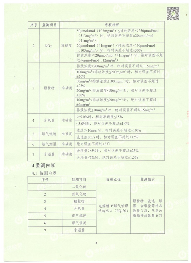 (1)監(jiān)測(cè)指標(biāo):顆粒物、二氧化硫、氮氧化物、含氧量、煙溫、流速、含濕量。 (2)監(jiān)測(cè)點(diǎn)位:3個(gè)電解煙氣出口(現(xiàn)用一個(gè)排口)分別進(jìn)行比對(duì)監(jiān)測(cè)。 (3)監(jiān)測(cè)頻次:每季度監(jiān)測(cè)一次,連續(xù)監(jiān)測(cè)1天,每天3-6次。 1.2電解槽煙氣治理設(shè)施總排口煙氣自行監(jiān)測(cè)