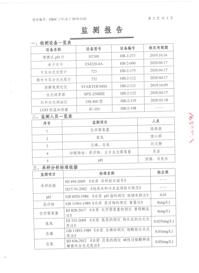 (1)監(jiān)測(cè)指標(biāo):pH值、五日生化需氧量、化學(xué)需氧量、氨氮、懸浮物、動(dòng)植物油、總磷、總氮。 (2)監(jiān)測(cè)點(diǎn)位:生活污水排放口。 (3)監(jiān)測(cè)頻次:每月監(jiān)測(cè)一次,監(jiān)測(cè)1天,每天監(jiān)測(cè)1個(gè)水樣。 2.2生產(chǎn)廢水排口