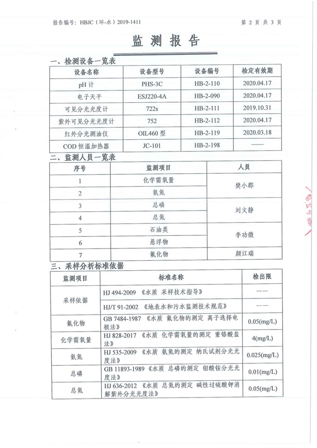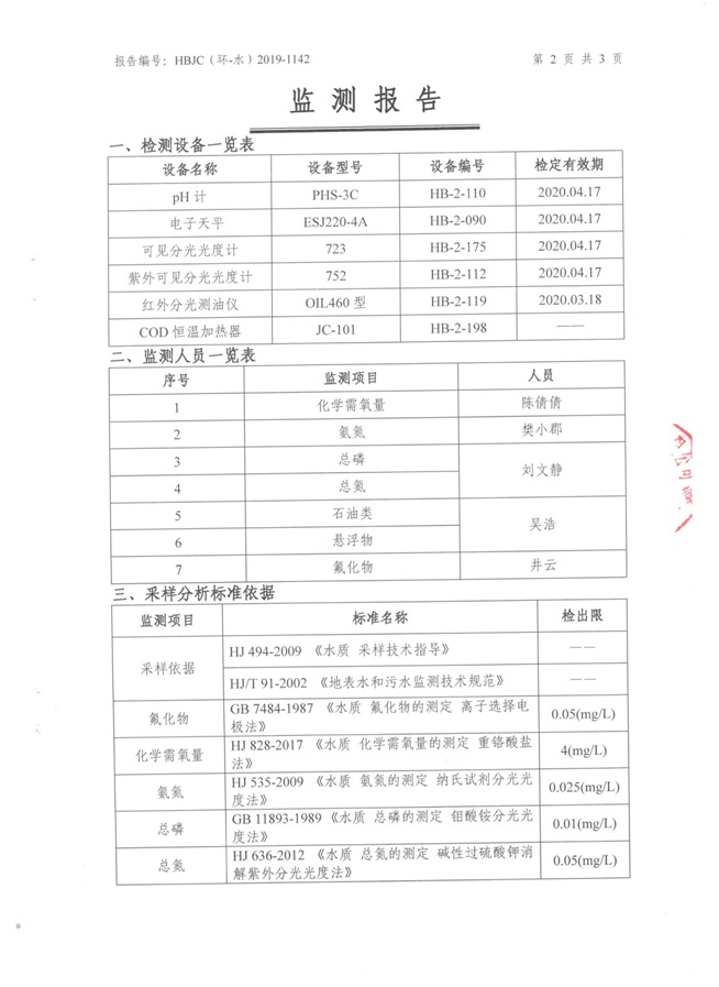 (1)監(jiān)測(cè)指標(biāo):化學(xué)需氧量、氨氮、懸浮物、總磷、石油類、氟化物、總氮。 (2)監(jiān)測(cè)點(diǎn)位:生產(chǎn)廢水排放口。 (3)監(jiān)測(cè)頻次:每月監(jiān)測(cè)一次,監(jiān)測(cè)1天,每天監(jiān)測(cè)1個(gè)水樣。 3廠界噪聲監(jiān)測(cè)
