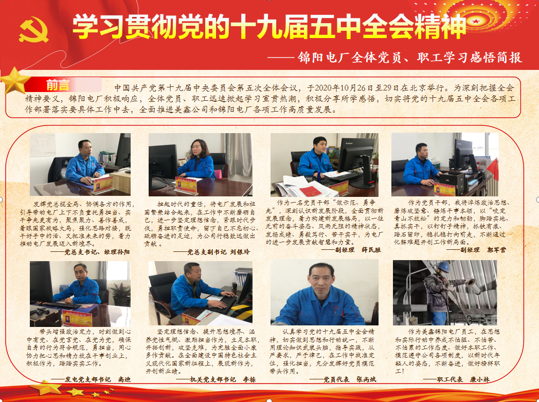 在公司宣講團(tuán)示范下,各基層單位多措并舉提高宣講實(shí)效:錦陽電廠黨總支通過動員部署、理論宣講、創(chuàng)辦感悟簡報等形式,指導(dǎo)職工認(rèn)真學(xué)習(xí)領(lǐng)會貫徹五中全會精神;陽極分公司黨總支成立宣講工作組,深入車間、班組一線,推動學(xué)習(xí)貫徹五中全會精神向一線延伸拓展……一場場形式多樣、具體務(wù)實(shí)的宣講活動,持續(xù)推動全會精神進(jìn)入思想進(jìn)入一線。