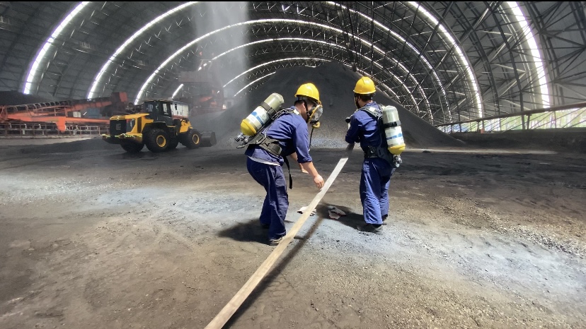 本次演練,燃運(yùn)部結(jié)合生產(chǎn)現(xiàn)場(chǎng)實(shí)際情況,參考大量事故案例,系統(tǒng)分析了燃運(yùn)部現(xiàn)階段潛在的風(fēng)險(xiǎn)隱患和事故應(yīng)急能力,模擬制定干煤棚存煤自燃火災(zāi)事故應(yīng)急演練預(yù)案;馂(zāi)發(fā)生后,現(xiàn)場(chǎng)巡檢人員發(fā)現(xiàn)火情后立即匯報(bào)當(dāng)班班長(zhǎng),班長(zhǎng)匯報(bào)部門(mén)值班領(lǐng)導(dǎo),部門(mén)接到火警后,立即啟動(dòng)消防應(yīng)急預(yù)案。演練現(xiàn)場(chǎng)多專(zhuān)業(yè)聯(lián)合處置,利用消防水炮、消防栓及車(chē)輛高壓沖洗水炮對(duì)前期明火進(jìn)行消除,防止事故擴(kuò)大。裝載機(jī)密切配合,將部分燃煤鏟運(yùn)至空曠區(qū)域,防止二次復(fù)燃。