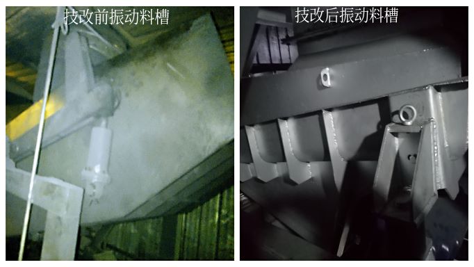 成型車間自投運(yùn)以來(lái),由于連續(xù)高強(qiáng)度運(yùn)行,處于磨合期設(shè)備存在的潛在問(wèn)題也逐漸顯現(xiàn),影響最大的是成型機(jī)振動(dòng)料槽工位,其原有設(shè)計(jì)為傾斜式振動(dòng)下料方式,利用翻板傾斜角度,依靠糊料自重以及小功率振動(dòng)器控制下料,由于傾斜角度偏大,糊料沖擊動(dòng)能較高,容易引起布料不均、物料偏析等問(wèn)題,導(dǎo)致擠壓成型后的生陽(yáng)極塊端頭麻面嚴(yán)重、裂紋頻出。