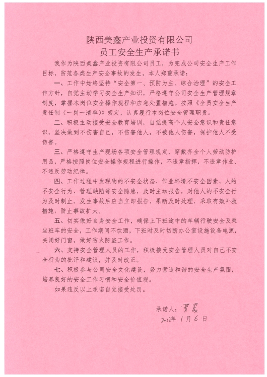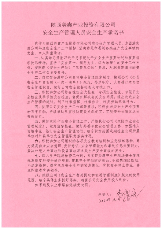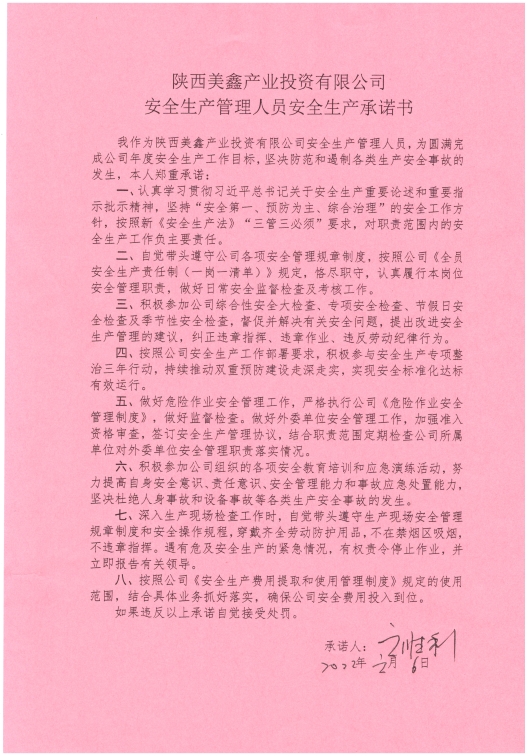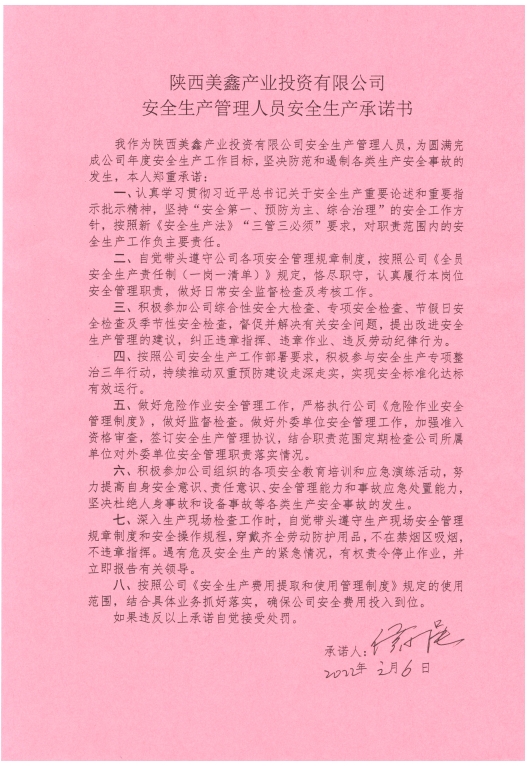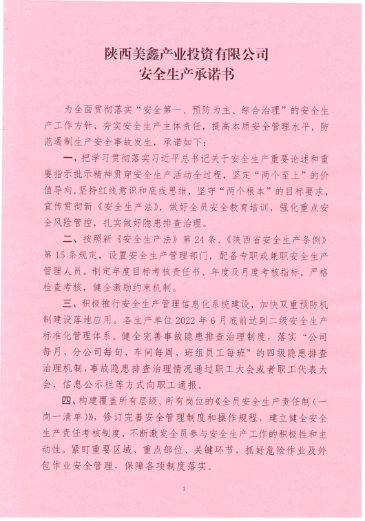 陜西美鑫產(chǎn)業(yè)投資有限公司安全生產(chǎn)承諾