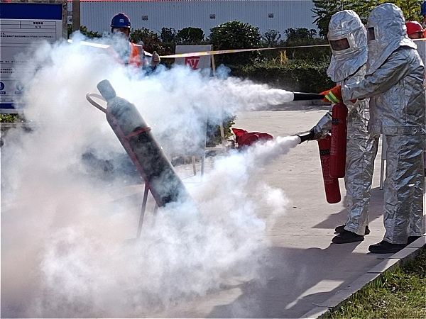 儲氫站屬于電廠重點防火管轄區(qū)域,氫瓶泄漏著火易引發(fā)氫氣爆炸事故。演練模擬巡檢人員在儲氫站巡檢時檢測氫氣超標,迅速跑到儲氫站外匯報值長并果斷采取通風措施。值長立即聯(lián)系檢修部汽機班進行緊急處理,同時匯報安環(huán)部及電廠領(lǐng)導。汽機班長帶人迅速趕到儲氫站查看,發(fā)現(xiàn)有一氫瓶泄漏,隨即聯(lián)系運行人員對儲氫站泄漏點做安全隔離措施;警戒組立即在周邊拉起警戒線,禁止無關(guān)人員進入現(xiàn)場,避免造成二次傷害;參與搶險人員做好個人防護,快速用推車將泄漏瓶移到儲氫站外,用滅火器對著火點進行滅火,并對泄漏氫瓶正確規(guī)范泄壓;馂膿錅绾螅(jīng)運行人員對儲氫站內(nèi)氫氣監(jiān)測結(jié)果顯示正常后,演練圓滿結(jié)束。