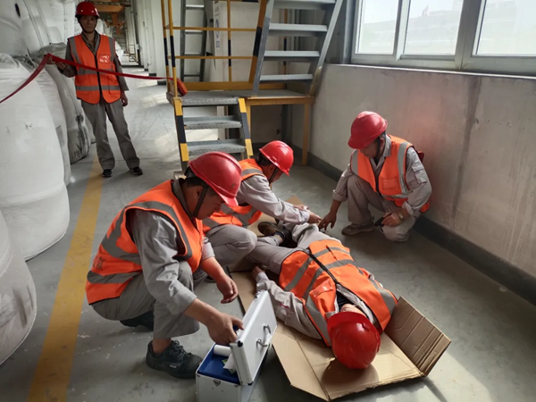 演練前,所有參演人員集中學(xué)習(xí)了高處墜落應(yīng)急預(yù)案和演練方案。本次演練現(xiàn)場(chǎng)模擬天車(chē)工在1#氧化鋁庫(kù)打料作業(yè)完成后,不慎從天車(chē)樓梯2米處滑落地面后,車(chē)間及時(shí)組織救援的過(guò)程。演練共分為事故發(fā)生、事故匯報(bào)、預(yù)案啟動(dòng)、現(xiàn)場(chǎng)緊急救治、送醫(yī)治療五部分!笆鹿省卑l(fā)生后,車(chē)間按照應(yīng)急預(yù)案迅速啟動(dòng)救援處置程序,各小組聞令而動(dòng)、密切配合、冷靜應(yīng)對(duì),整個(gè)過(guò)程組織有序、反應(yīng)迅速、程序合理,演練達(dá)到了預(yù)期效果。演練結(jié)束后,應(yīng)急演練總指揮對(duì)演練情況進(jìn)行總結(jié)點(diǎn)評(píng)。