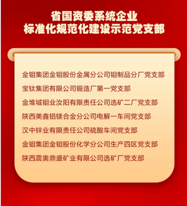 近日,從陜西省國(guó)資委系統(tǒng)企業(yè)破解國(guó)企黨建“融入不深”暨黨支部標(biāo)準(zhǔn)化規(guī)范化建設(shè)經(jīng)驗(yàn)交流會(huì)上傳來(lái)喜訊,公司下屬鋁鎂合金分公司電解一車間黨支部榮獲陜西省國(guó)資系統(tǒng)“標(biāo)準(zhǔn)化規(guī)范化示范黨支部”,是陜西有色金屬集團(tuán)此次7個(gè)獲得“標(biāo)準(zhǔn)化規(guī)范化建設(shè)示范黨支部”榮譽(yù)的黨組織之一。該項(xiàng)榮譽(yù)的取得,不僅是對(duì)公司黨支部標(biāo)準(zhǔn)化規(guī)范化建設(shè)工作取得成效的認(rèn)可,也進(jìn)一步激發(fā)了公司全體干部職工干事創(chuàng)業(yè)活力,為公司生產(chǎn)經(jīng)營(yíng)各項(xiàng)工作的持續(xù)向上向好鼓舞了士氣。