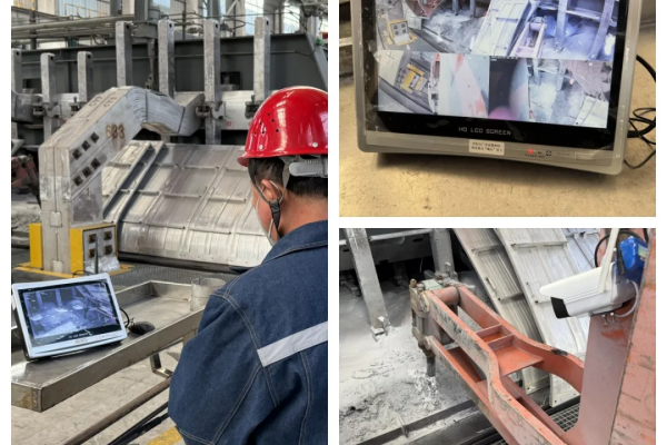 該系統(tǒng)創(chuàng)新性地構(gòu)建了“天車視覺中樞+移動終端”的作業(yè)體系。在電解槽上方安裝4K雙目攝像頭,通過無線傳輸?shù)姆绞剑瑢崟r畫面?zhèn)魉偷匠鲣X小車的顯示屏上,天車工只需在車間出鋁端路面借助多屏聯(lián)動就能完成操作。顯示屏的雙畫面可顯示打殼機頭全景,還能呈現(xiàn)機械臂特寫畫面,另外的畫面則通過安裝在天車上部的多個攝像頭,以俯瞰視角進(jìn)行實時監(jiān)控。在抗干擾設(shè)計方面,技術(shù)團(tuán)隊采用多層電磁屏蔽材料包裹線纜,有效將磁場干擾降低85%,確保在800高斯的強磁場環(huán)境中也能穩(wěn)定成像。