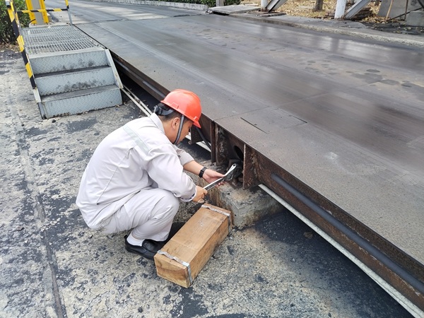 大宗原材料進出場的精準計量是企業(yè)生產(chǎn)平穩(wěn)運行的關(guān)鍵環(huán)節(jié)。7月181420分,質(zhì)檢計量中心接到緊急報告:陽極磅房磅秤突發(fā)傳感器傾斜、秤體移位故障,導致石油焦運輸車輛無法正常過磅。時值高溫保供關(guān)鍵期,若不及時排除故障,將直接影響物料流轉(zhuǎn)效率,甚至延誤生產(chǎn)進度。